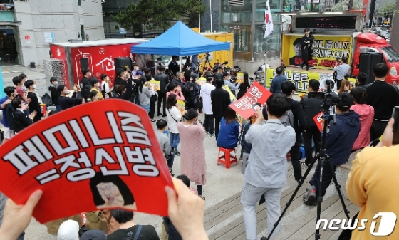 다음 카페 '여성시대'와 사상과 가치관을 공유하는 극렬 페미니스트 조직입니다 페미니스트. 한 집회 참가자가 문재인 대통령을 뜻하는 '곰'이라는 글자가 적힌 종이를 들고 무릎을 꿇고 있다.